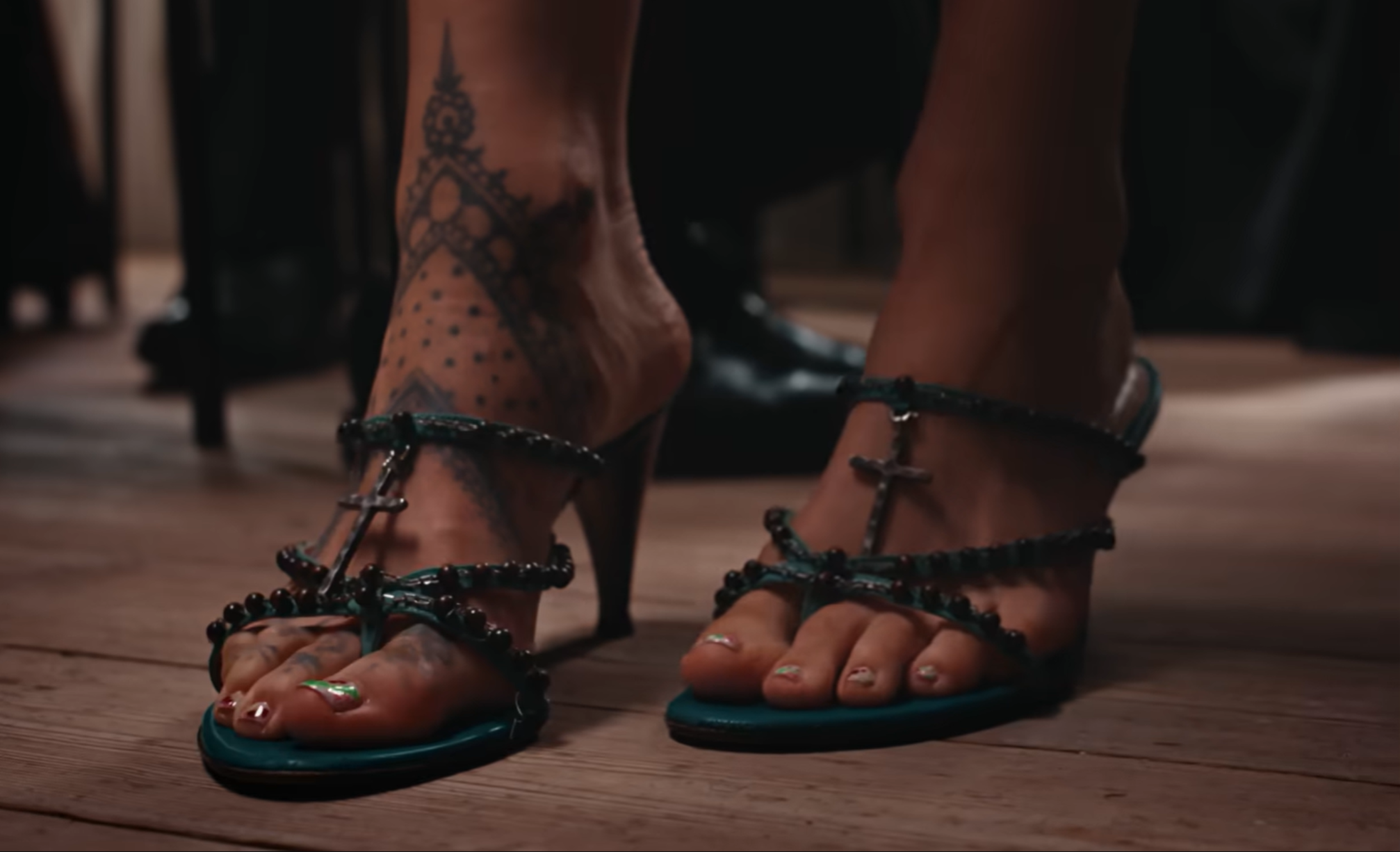 We see a close-up of Rosalía’s shoes made of rosary beads.