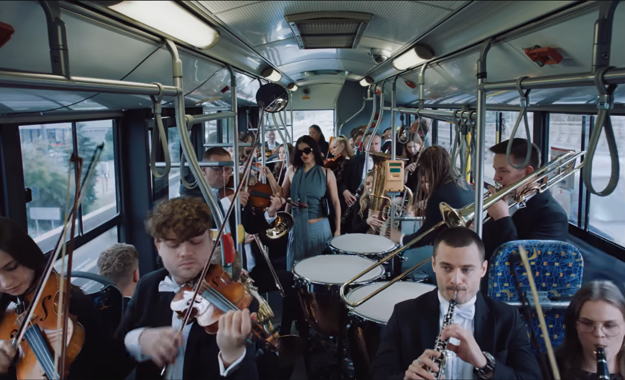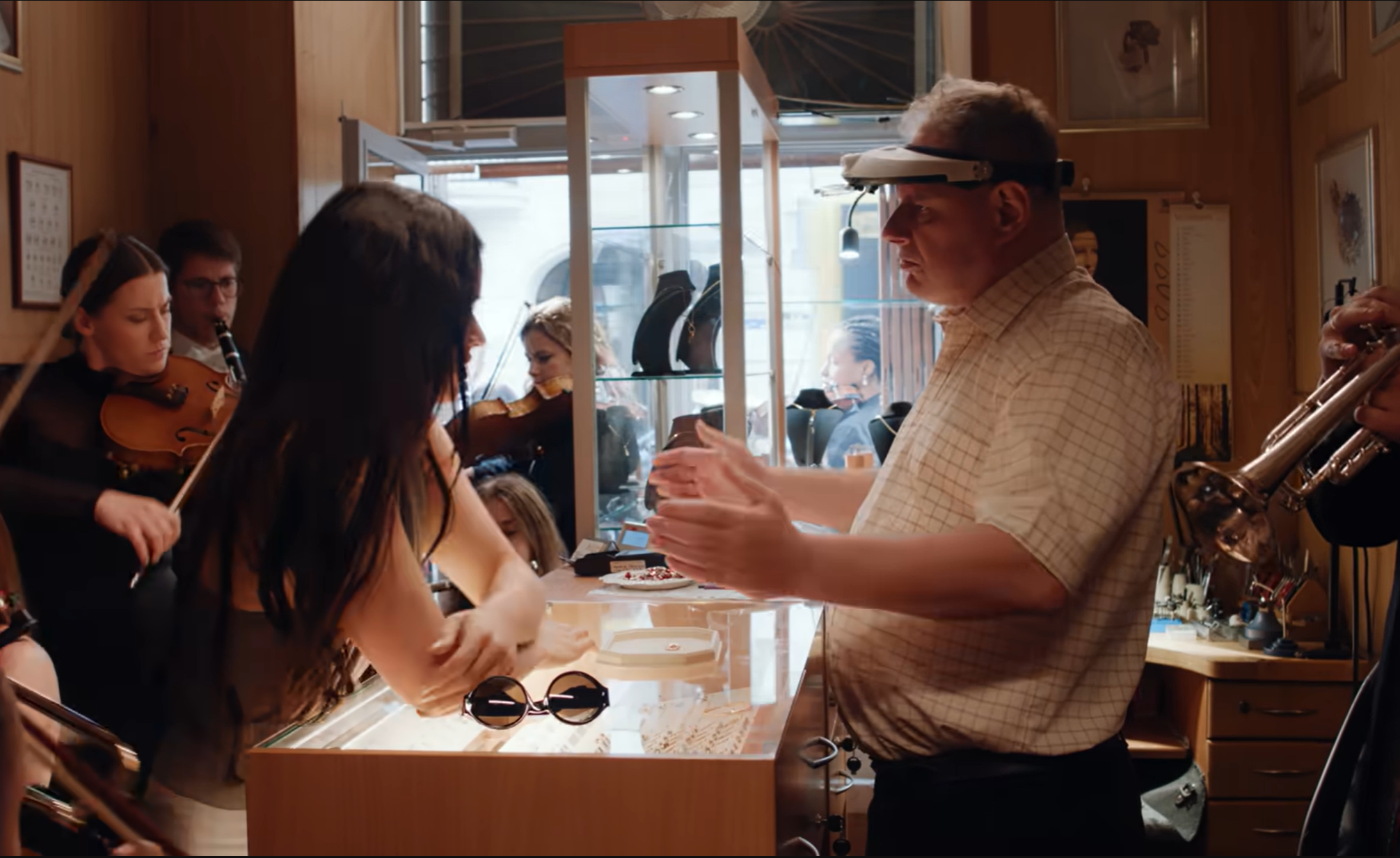 Throughout the video, Rosalía is followed everywhere by a full orchestra. They appear in buses, shops, streets, never leaving her side as a visual metaphor for intrusive thoughts and grief that follows you everywhere.